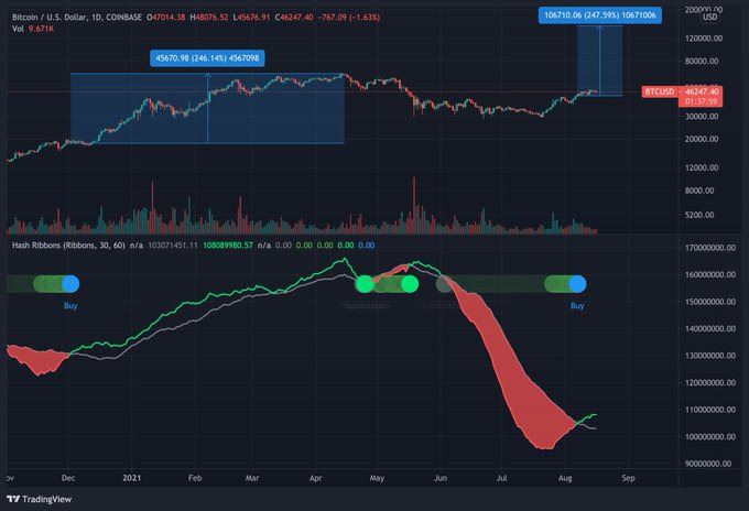 ´Bullish Signal That Resulted In A 250% Increase In Bitcoin Is Getting Triggered Again´. Dat is dan de Hash Ribbon Indicator waarover we u al eerder berichtten in deze Cryptonieuwsbrief; dat unieke signaal dat zich de laatste keer voordeed in december 2020. Tjonge jonge, was dát ff een koopsignaal?! ´t Deed zich op 6 augustus al heel pril weer voor, tot op vandaag, en dit onderschrijf ik persoonlijk.
