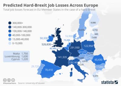 Uit een onderzoek van de Belgische Universiteit Leuven blijkt dat er naar schatting ruim 73.000 banen verloren zullen gaan in Nederland door de harde Brexit die op 31 oktober 2019 zal plaatsvinden. 1,2 miljoen banen verloren in Europa door Brexit Hieronder via Statista een overzicht van aantal banen dat in de Europese Unie naar alle […]