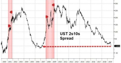 Op Zerohedge een aantal grafieken, waaronder deze hieronder, over onder andere de spread tussen het tienjarige en tweejarige Amerikaanse staatspapier. Momenteel bevindt deze spread zich op het niveau van eind 2017, precies net voordat de laatste kredietcrisis begon. Rentecurve Een nieuwe recessie lijkt met de omgekeerde rentecurve dan ook onvermijdelijk. De omgekeerde rentecurve is een […]